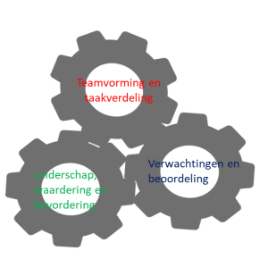 Voor de passende insteek van Erkennen & Waarderen bij UMC-Groningen kwam er ook een tekening. Het werden drie tandwielen die in elkaar draaien, met in elk tandwiel zijn eigen thema’s. Teamvorming & taakverdeling, Leiderschap & waardering & bevordering, verwachtingen & beoordeling.