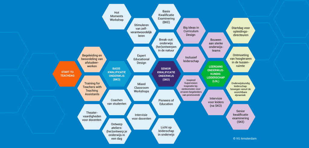 On the website ctl-vu.nl, teachers can consult a current, interactive version of the development path and select examples of possible development paths. Each honeycomb represents a pathway that can be followed separately. Teachers decide which honeycombs they want to follow. This allows them to choose offerings that match their current learning needs.